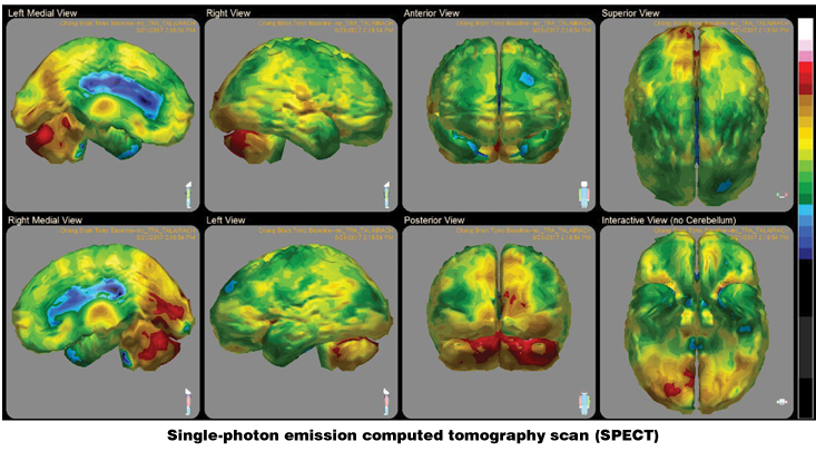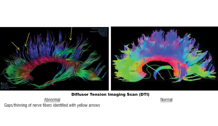 These objective tests, further described below, include advanced radiologic techniques that go far beyond the standard MRI or CT scan, including volumetric scans measuring brain atrophy, perfusion scans measuring decreased blood flow, fMRI scans measuring decreased blood flood during cognitive processes, DTI scans measuring impaired nerve signal transmission, SWI scans that detect subtle microbleeds, MRS scans measuring abnormal metabolite ratios, PET scans measuring impaired glucose/energy uptake, SPECT scans creating 3-D models of impaired blood flow, as well as auto-antibodies blood tests, neuroendocrine blood tests, neuro-optometric testing, vestibular and balance testing, and neuropsychological and speech pathology testing.
