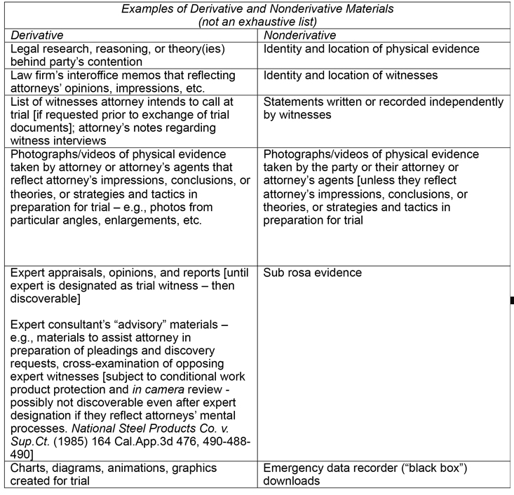 “Nonderivative” materials are those that are only evidentiary in character – e.g., black-box downloads, identity/location of witnesses, photos/video of physical evidence (including sub rosa), statements prepared independently by witnesses, etc. These are not protected – even if you did a lot of “work” getting them. (Mack v. Sup.Ct. (1968) 259 Cal.App.2d 7, 10; Aerojet-General Corp. v. Transport Indem. Ins. (1993) 18 Cal.App.4th 996, 1004.)