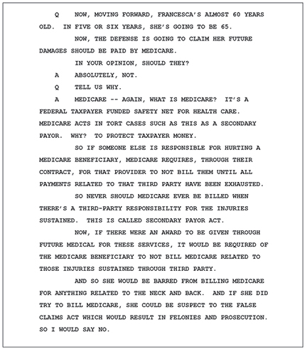 Should defense experts claim that Medicare should be used to determine the reasonable value for the treatment that your client received, you can cross them on several hot-button issues. For example, you can simply establish your client is not currently a Medicare recipient (must be 65+, have a certain disability, be an ALS patient, or have end stage renal disease), so the numbers don’t apply to them.