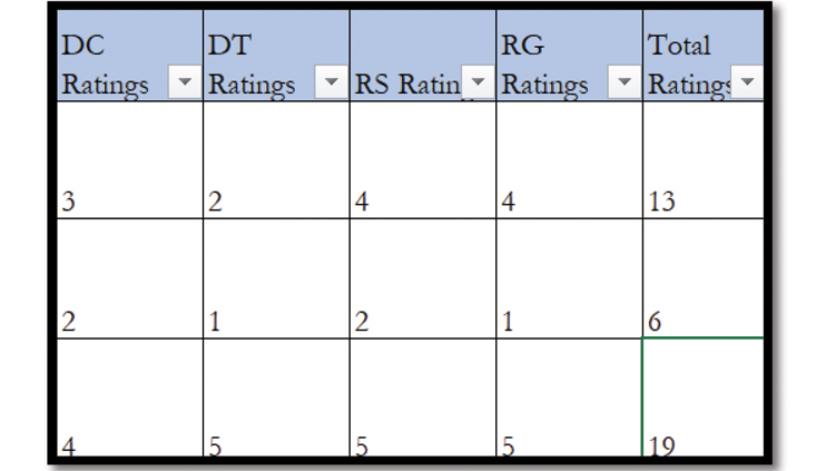 But there’s more. We also have a set of columns where each lawyer on the team individually rates the importance of each witness on a scale of 1 to 5 (See Fig 3 on page 22).