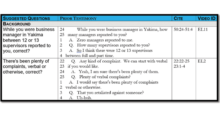 When we have prepared video clips for potential impeachment, as in the above example, we add a column with the video clip identifier used to cue up the appropriate clip in TrialDirector (our preferred trial presentation software), once again so we can play the clip without the need to cross-reference another document.