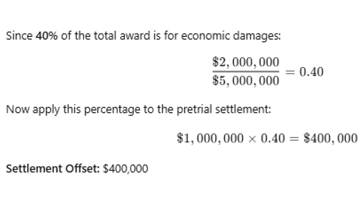 Since 40% of the jury’s verdict comprised of economic damages, only 40% of the $1,000,000 pretrial settlement is offset. Thus, $400,000 is reduced from the jury’s verdict based on the $1,000,000 pretrial settlement.